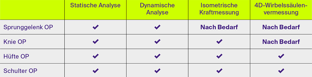 Sinnvolle Zeitpunkte für eine Bewegungsanalyse sind kurz vor einer Operation als Basis-Testung sowie im Verlauf der Rehabilitation. Je nach Heilungsprozess und individuellen Zielen kann eine post-operative Untersuchung etwa drei, sechs oder neun Monate nach dem Eingriff sinnvoll sein. Unsere Pakete orientieren sich an Zeitpunkten, die sich in der Praxis besonders bewährt haben. Das Komplettpaket beinhaltet eine Messung vor der Operation sowie zwei Verlaufsmessungen nach drei und neun Monaten. Eine zusätzliche Kontrolle nach sechs Monaten kann bei Bedarf jederzeit ergänzt werden.