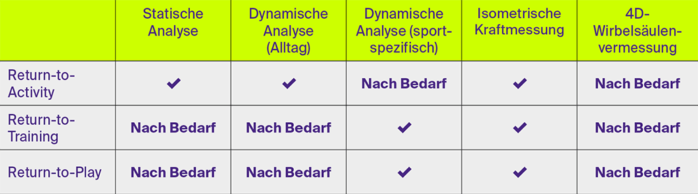 Unser Anspruch ist es, Methoden aus dem Leistungs- und Spitzensport für Sportlerinnen und Sportler aller Leistungsniveaus zugänglich zu machen. Sinnvolle Zeitpunkte für eine Analyse liegen häufig etwa drei, sechs oder neun Monate nach der Verletzung. Die konkrete Wahl der Messzeitpunkte richtet sich immer nach der Art der Verletzung, der jeweiligen Sportart, dem Verlauf der Rehabilitation und den persönlichen Leistungszielen.