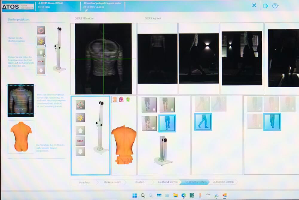 Neben der Kraft analysieren wir auch, wie der Körper diese Fähigkeiten im Alltag nutzt. Mithilfe moderner Biomechanik-Systeme von DIERS betrachten wir unter anderem, wie Sie stehen und Ihr Gewicht verteilen, wie Sie gehen oder Treppen steigen und wie Sie typische Bewegungen des Alltags ausführen. Dabei achten wir besonders darauf, wie stabil Knie, Hüfte und Rumpf arbeiten. Optional können zudem Ihr Becken und Ihre Wirbelsäule mittels modernster 4D-Wirbelsäulenrekonstruktion vermessen werden. Die gewonnenen Daten ermöglichen es, Therapie, Training und Belastungsaufbau gezielt anzupassen. Die Analyse schafft Transparenz im Rehabilitationsprozess und gibt sowohl Patientinnen und Patienten als auch Therapeutinnen und Therapeuten eine klare Orientierung.